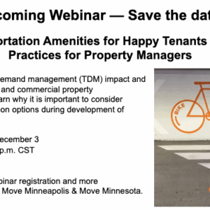 Upcoming Webinar from Move Minneapolis — Save the date! Transportation Amenities for Happy Tenants - Best Practices for Property ... 03 Dec 12:00 pm - 1:00 pm Virtual