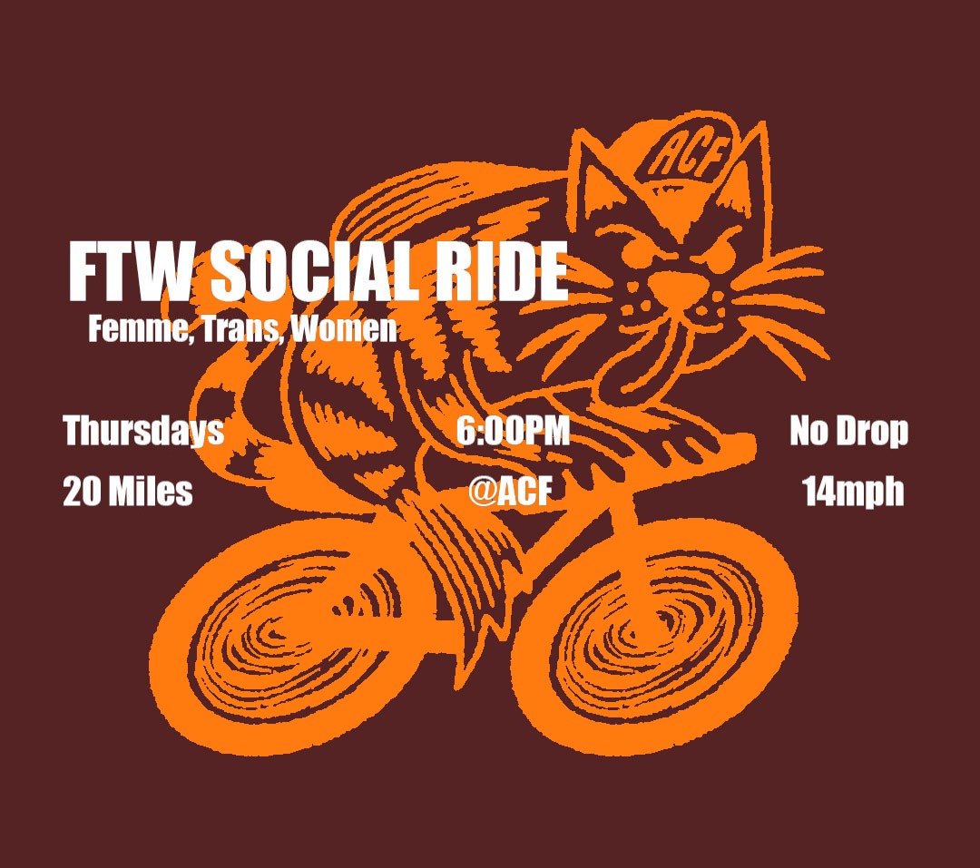 Description: FTW led, social ride. Intended for femme, trans or women only. This is a great ride like our social Wednesday to learn basic group ride etiquette, create friendships and get stronger as a collective.