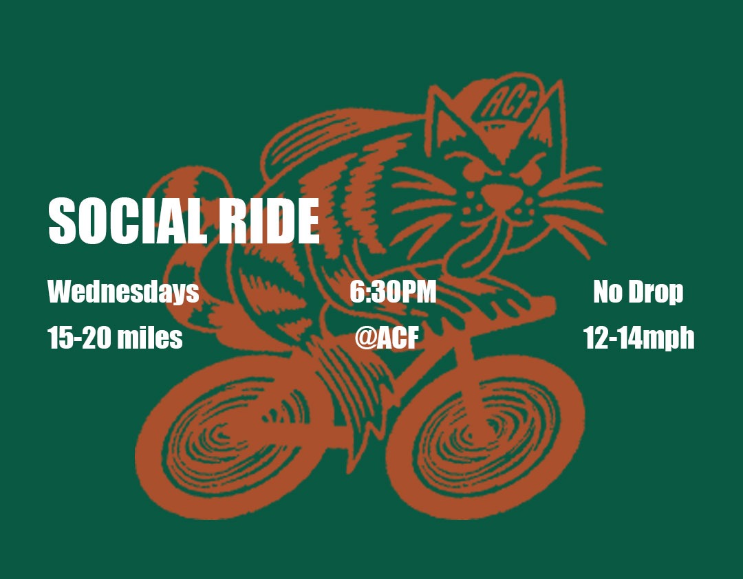 Description: Social ride pace, all welcome! A great ride to come learn the basics of group riding, create friends and work on getting stronger as a collective. Ride will end with at a beverage respite establishment.