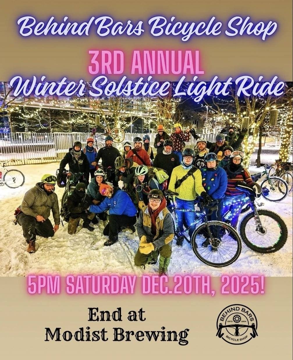 It’s that time of the year again! Adorn your bike is decorative holiday lights and join us for our 3rd annual Winter Solstice Light Ride here on Saturday December 20th, 2025.