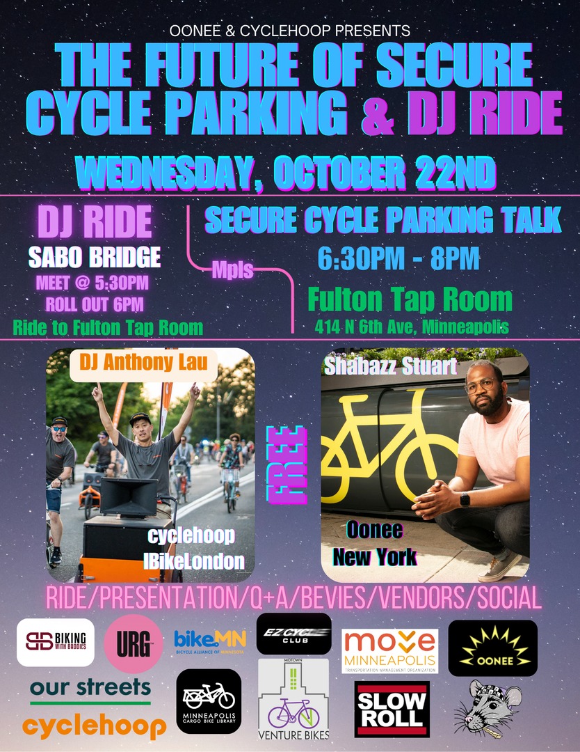 Join Cyclehoop and Oonee for a DJ group ride from Sabo Bridge to Fulton Tap Room, where you can hear about secure cycle parking networks in London and New York. There will be an update on the future of the Minneapolis secure cycle parking pilot.