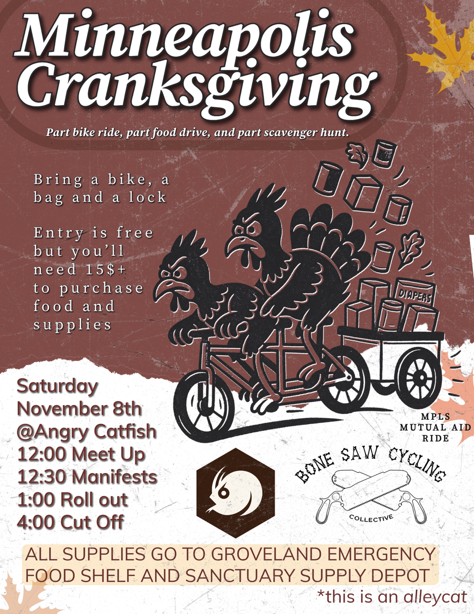 Part bike ride, part food drive, and part scavenger hunt in partnership with Angry Catfish and Bone Saw Cycling Collective.