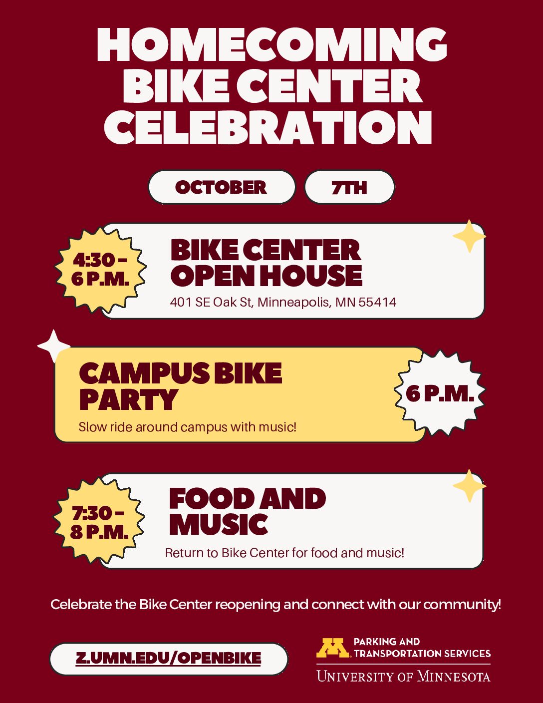 Home Rides Social U of M Bike Center Celebration U of M Bike Center Celebration 4:30pm-6pm Bike Center Open House 6pm Campus Bike Party! 7:30pm-8pm Food and Music + Add to Google Calendar + iCal / Outlook export Date Oct 07 2025 Time 4:30 pm - 6:00 pm Event Registration Read More Location University of Minnesota Bike Center 401 SE Oak St Minneapolis, MN 55414 Category Rides Social Read More Share this event